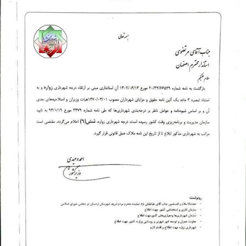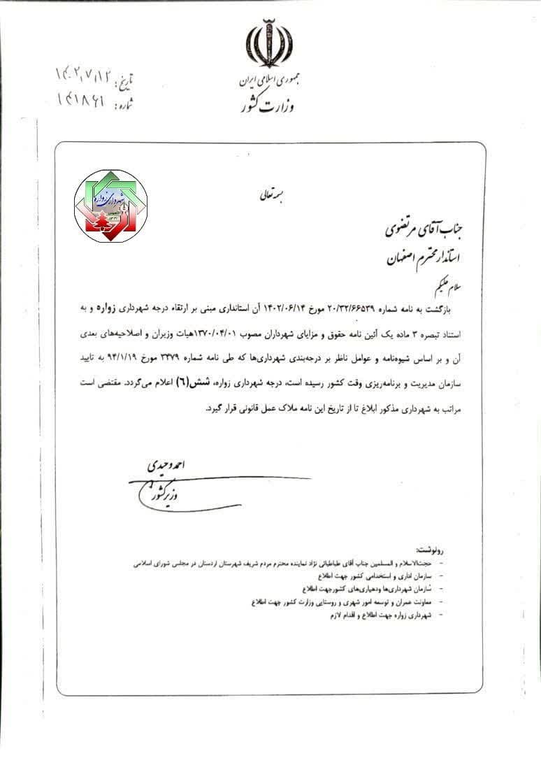 اقای احمدوحیدی وزیر محترم کشور طی نامه ای به استاندار اصفهان، ارتقا درجه شهرداری زواره از درجه 5 به درجه 6 را ابلاغ نمود. 📌 لازم بذکر است آخرین ارتقا درجه شهرداری زواره به سال 1377( زمان شهرداری اقای گلابی) بر میگردد، که امسال با پیگیری شهرداری و شورای اسلامی شهر دردوره ششم این تغییر و ارتقا درجه از وزارت کشور ابلاغ گردید